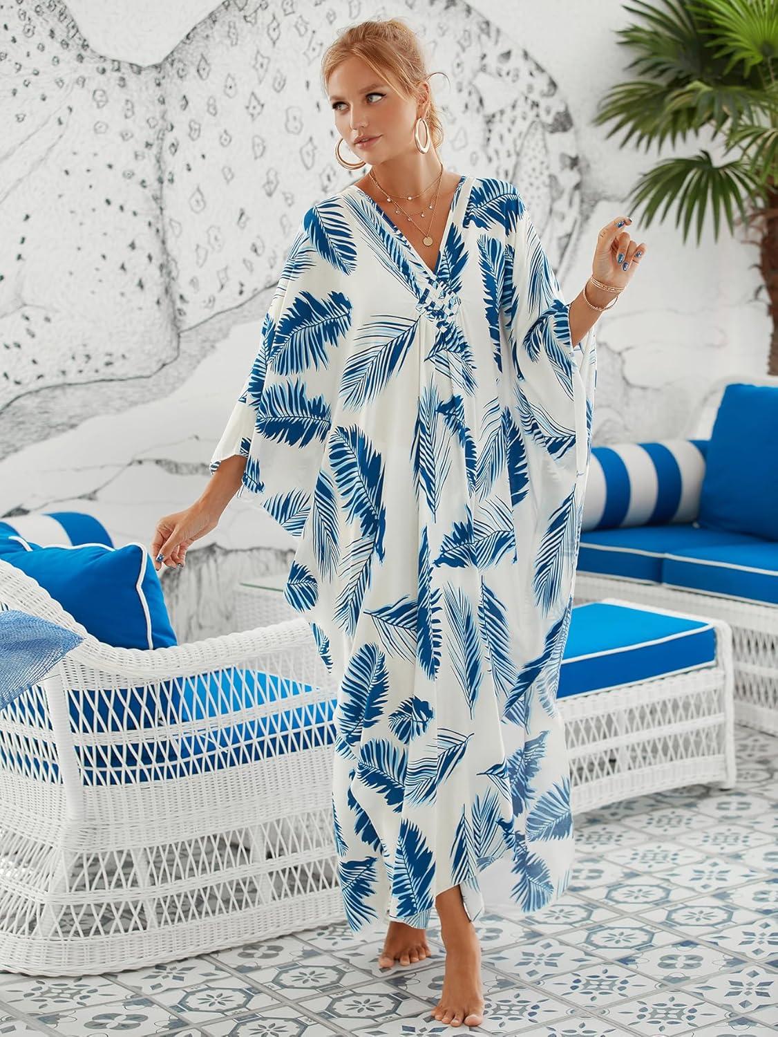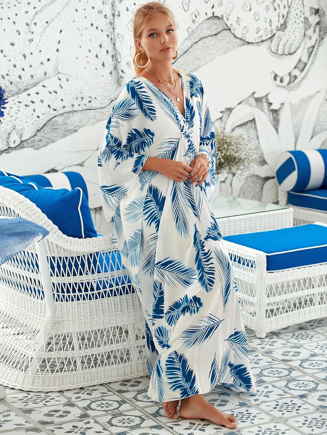 Moss Rose Caftan Coverup Dresses for Women V Neck Summer Swimsuit Kaftan Plus Size Maxi Beach Vacation Clothes(A-green Leaf)