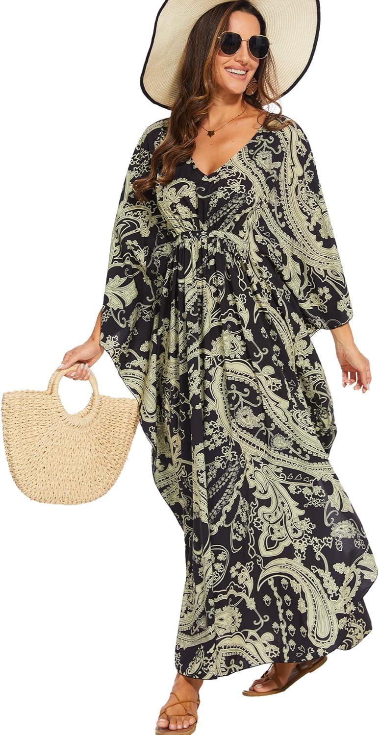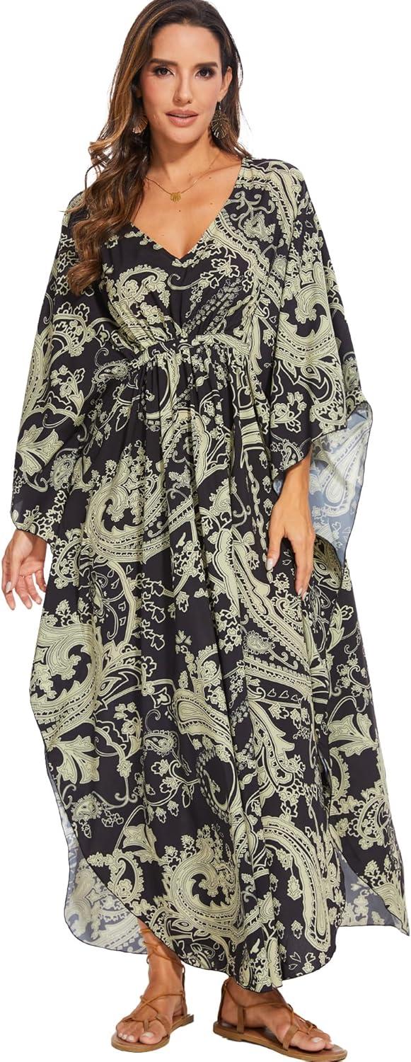 Moss Rose Kaftan Dresses for Women V Neck Summer Swimsuit Cover up Caftan Maxi Beach Dresses(A-black Green)
