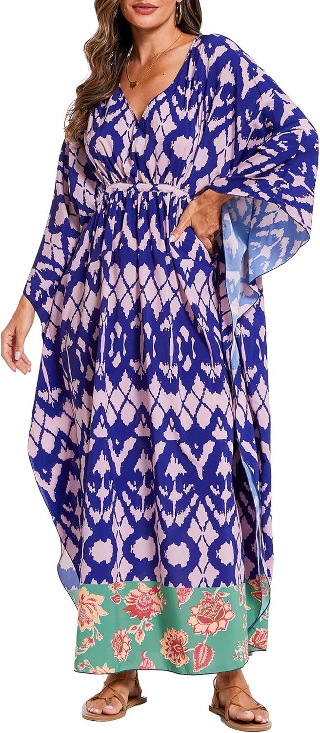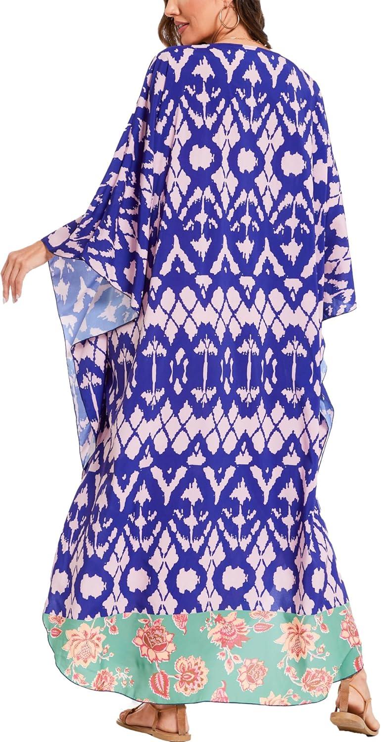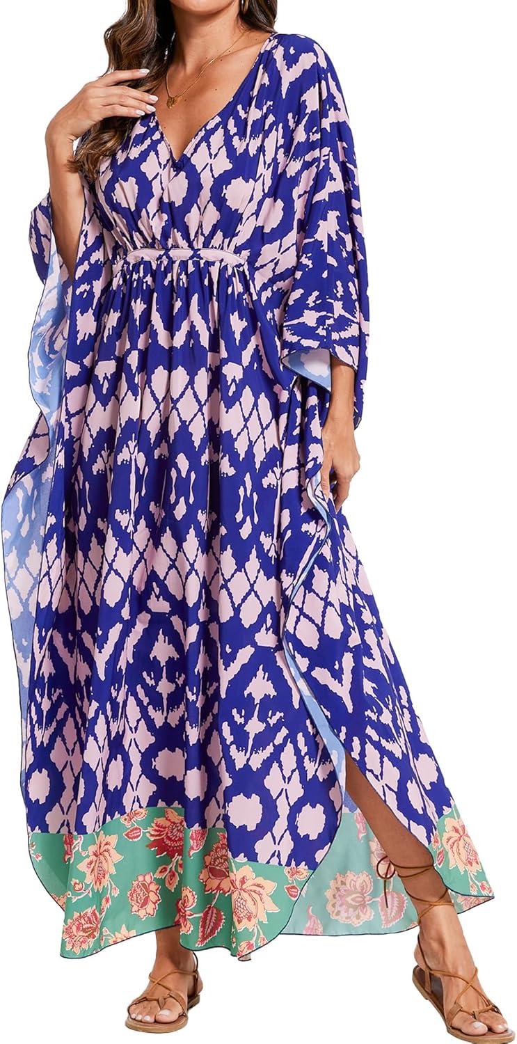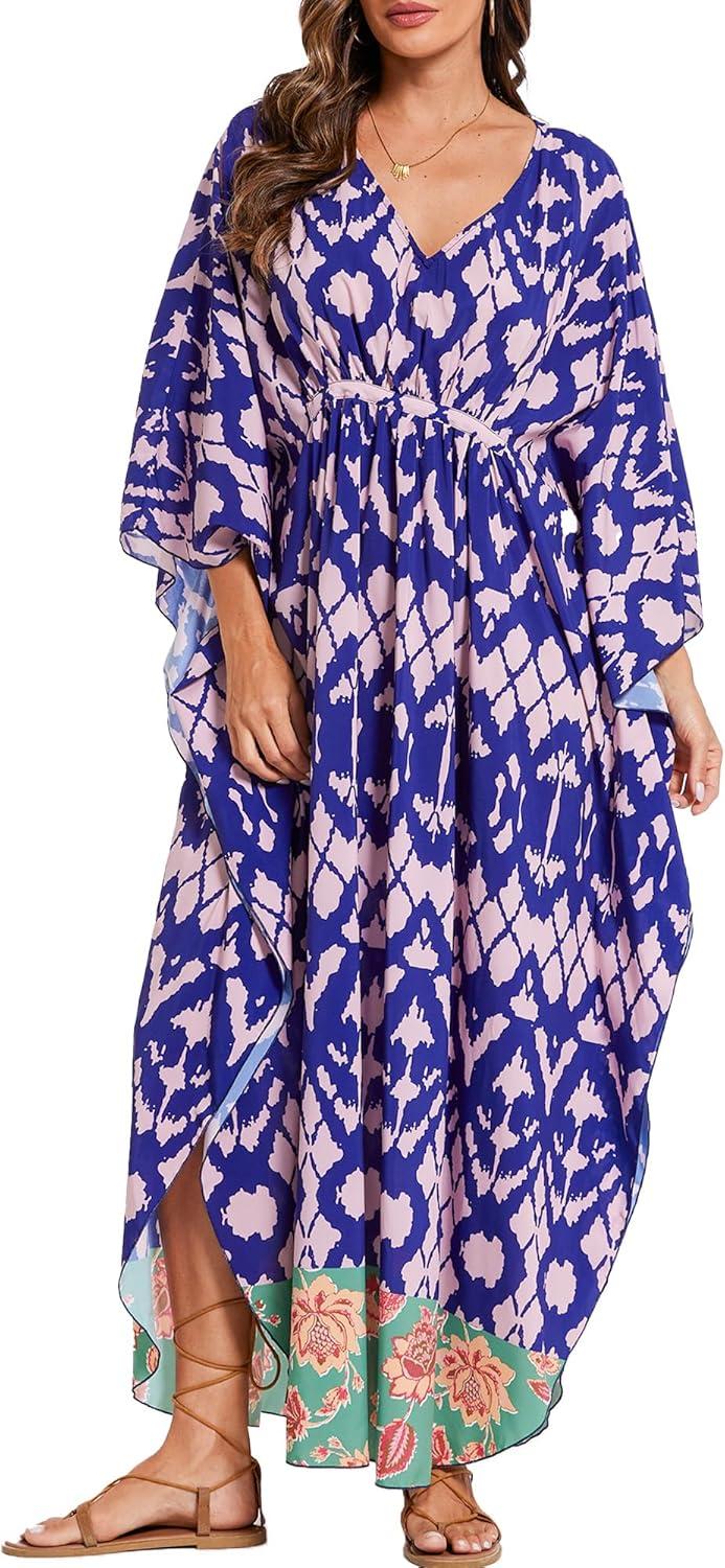 Moss Rose Kaftan Dresses for Women V Neck Summer Swimsuit Cover up Caftan Maxi Beach Dresses(A-purple)