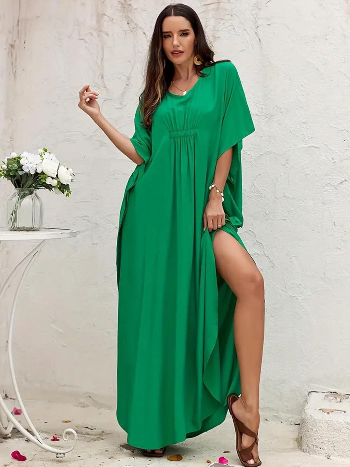 Moss Rose Kaftan Dresses for Women V Neck Summer Swimsuit Cover up Caftan Maxi Beach Dresses(C-dark Green)