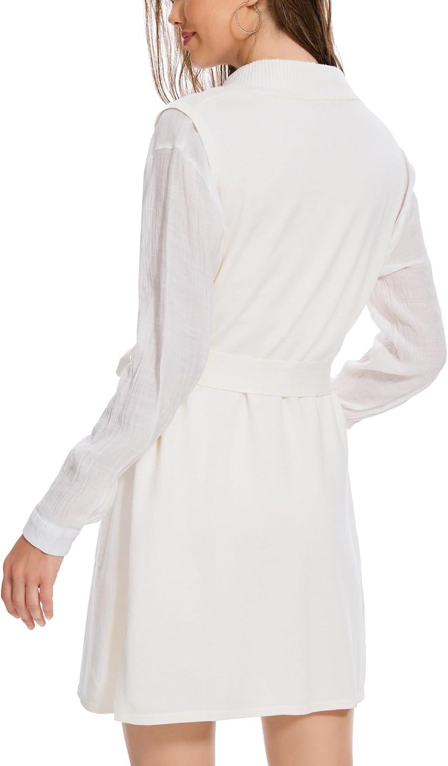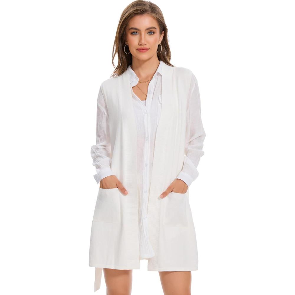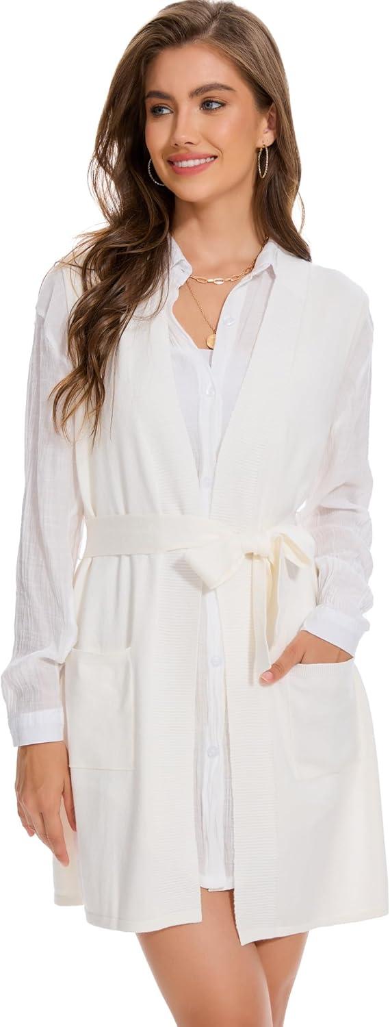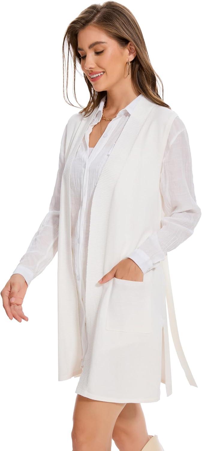Moss Rose Long Vest for Women Sleeveless Cardigans Ribbed Knit Outwear with Belt and Pockets(Off-white)
