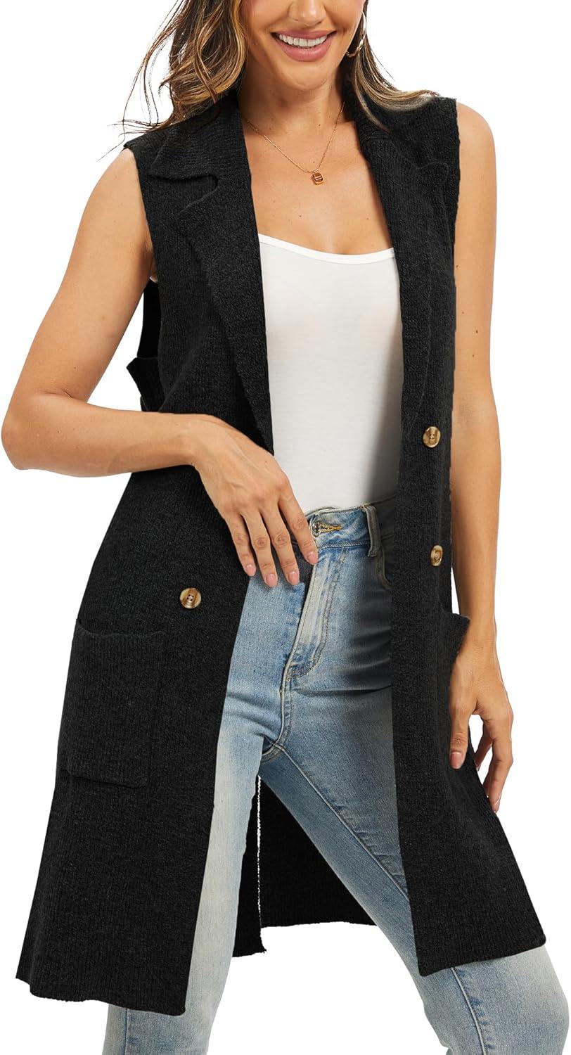 Moss Rose Sleeveless Cardigans for Women Open Front Sweaters Vest Lapel Collar Button Down Long Outerwear Coats(Black)