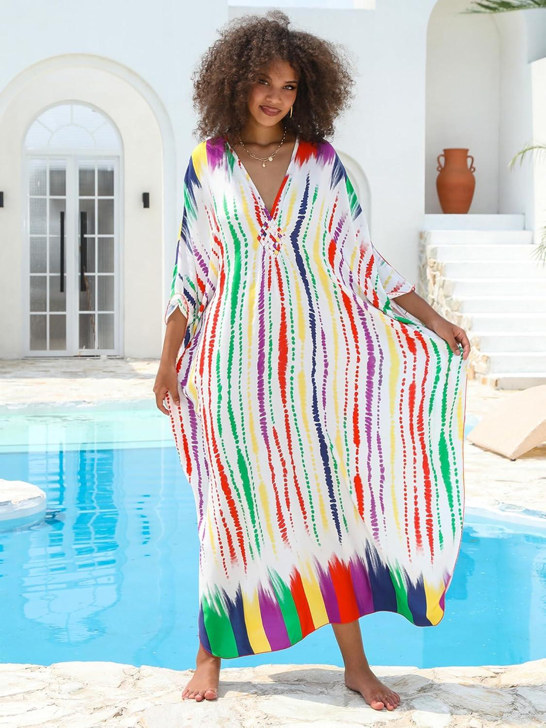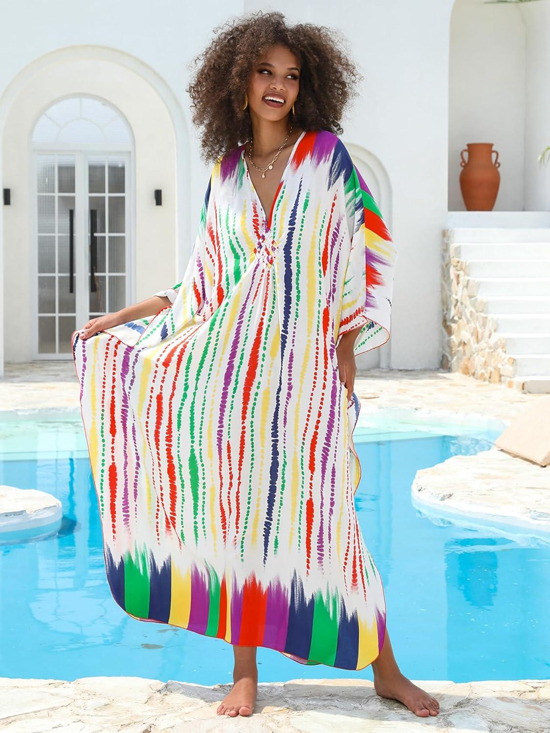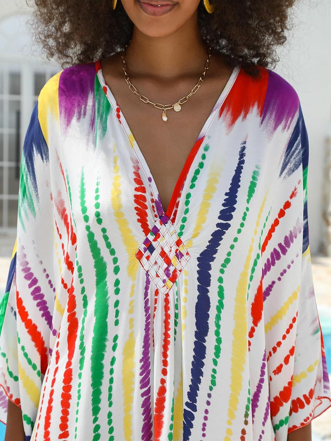 Moss Rose Women Summer Caftan Coverups Dress Kimono Beach Vacation Wear V Neck Print Maxi Boho Dress(B-rainbow)