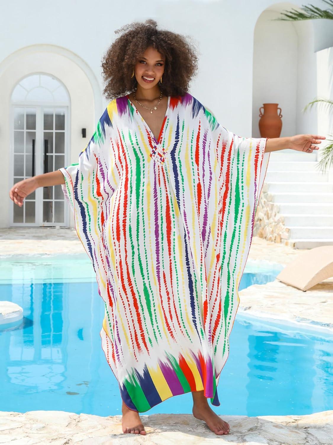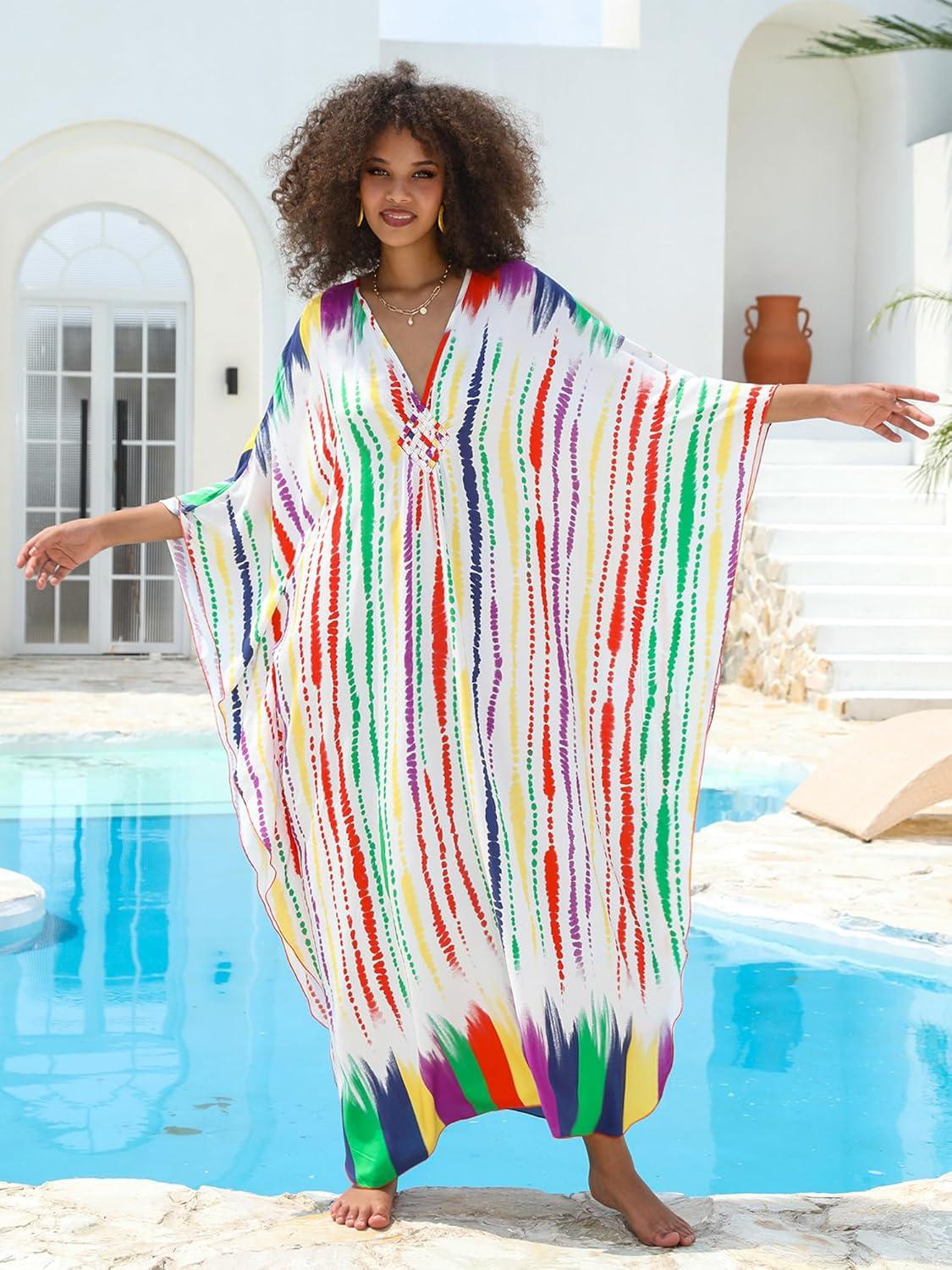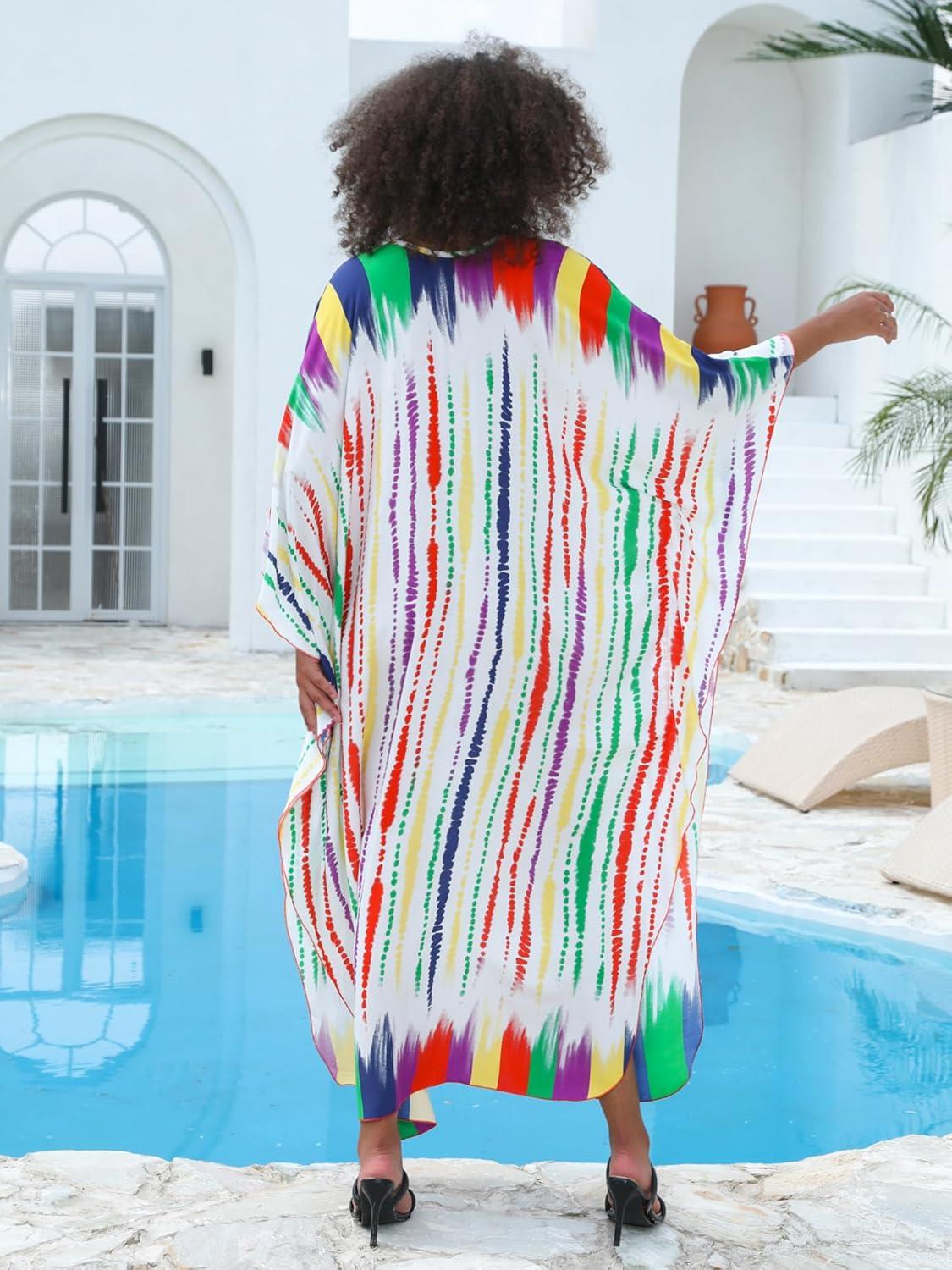 Moss Rose Women Summer Caftan Coverups Dress Kimono Beach Vacation Wear V Neck Print Maxi Boho Dress(B-rainbow)