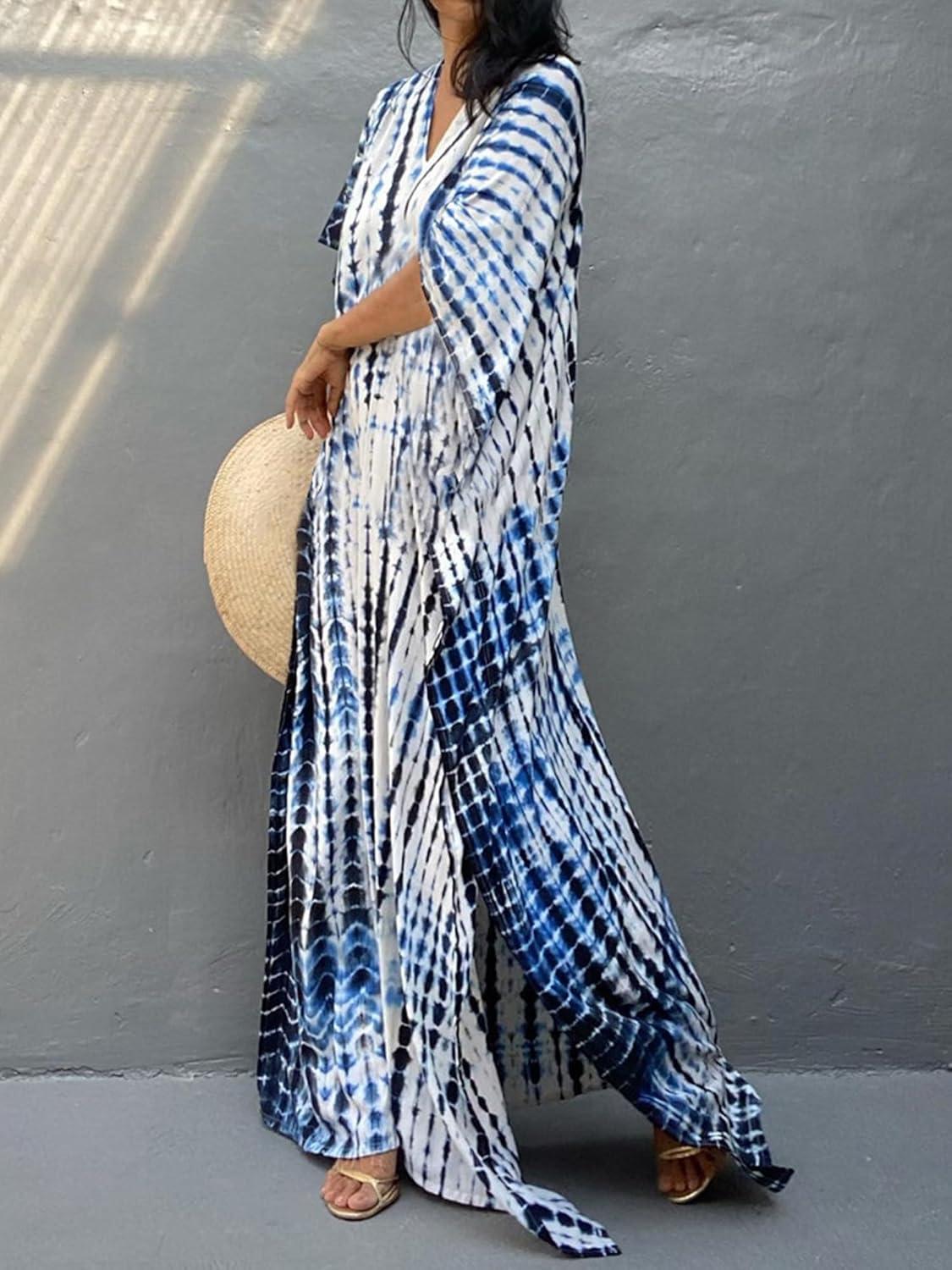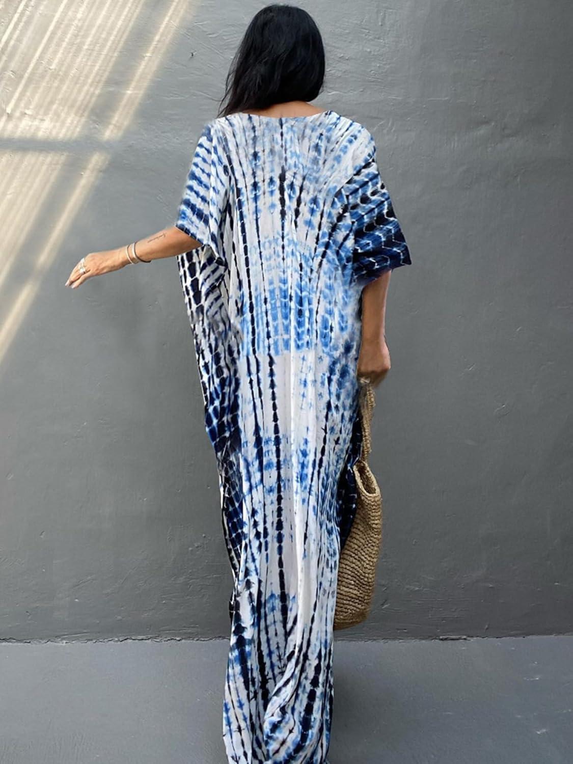Moss Rose Women Summer Caftan Coverups Dress Kimono Beach Vacation Wear V Neck Print Maxi Boho Dress(Blue Black)