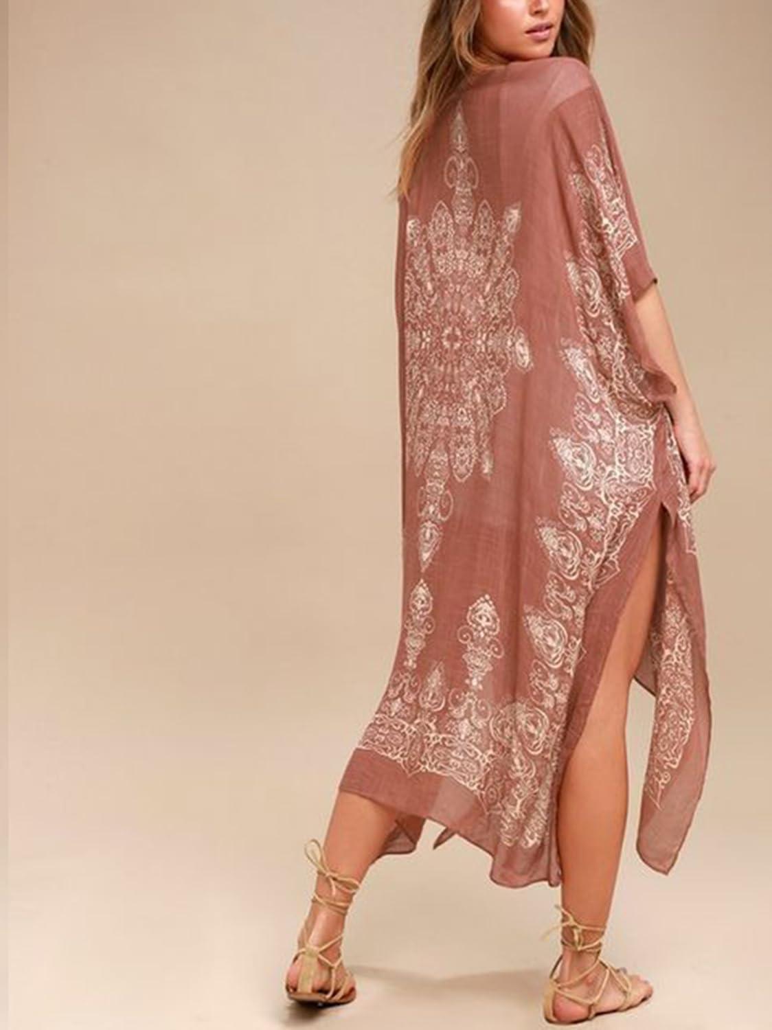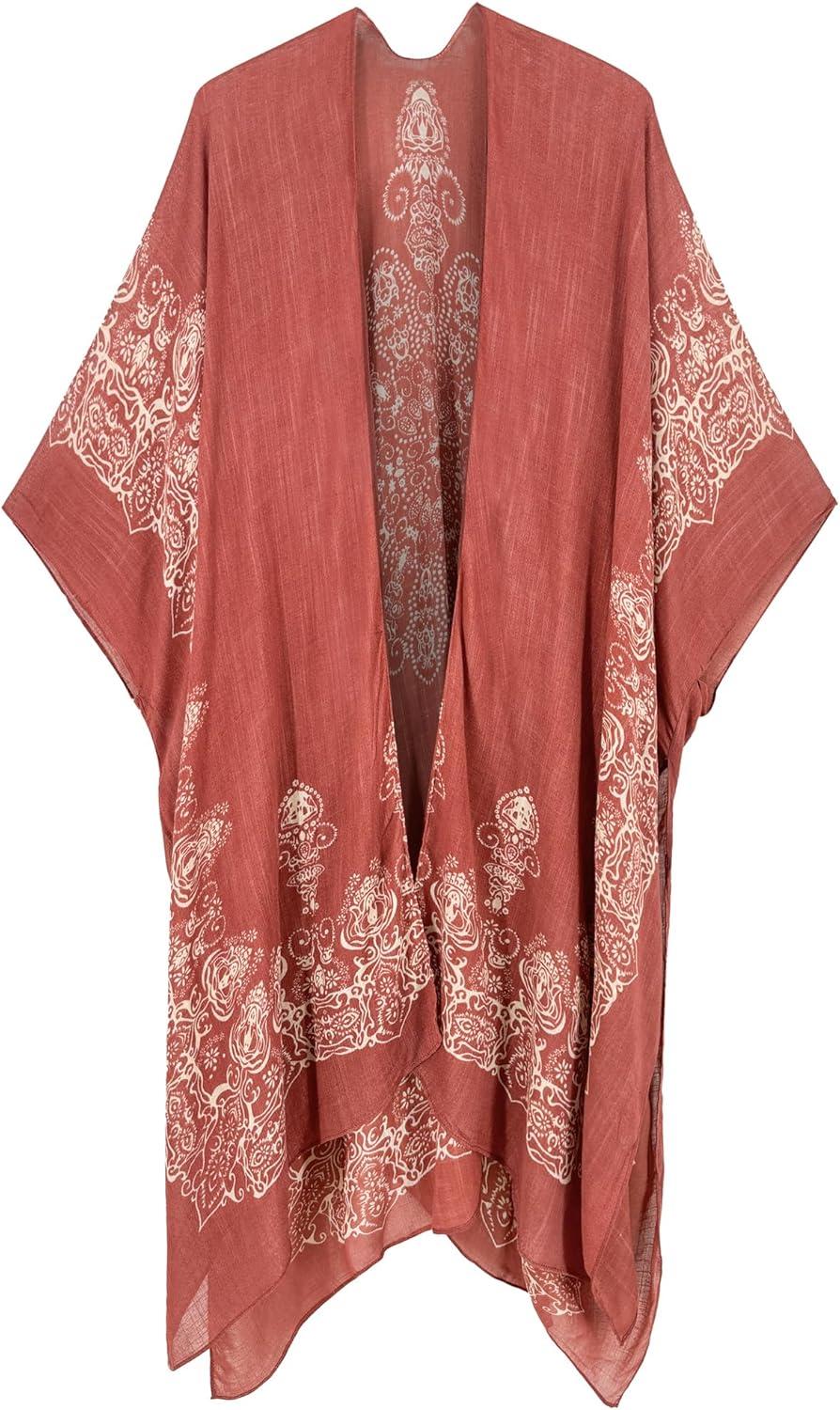 Moss Rose Women’s Beach Cover up Swimsuit Kimono with Bohemian Floral Print, Loose Casual Resort Wear(B Red)
