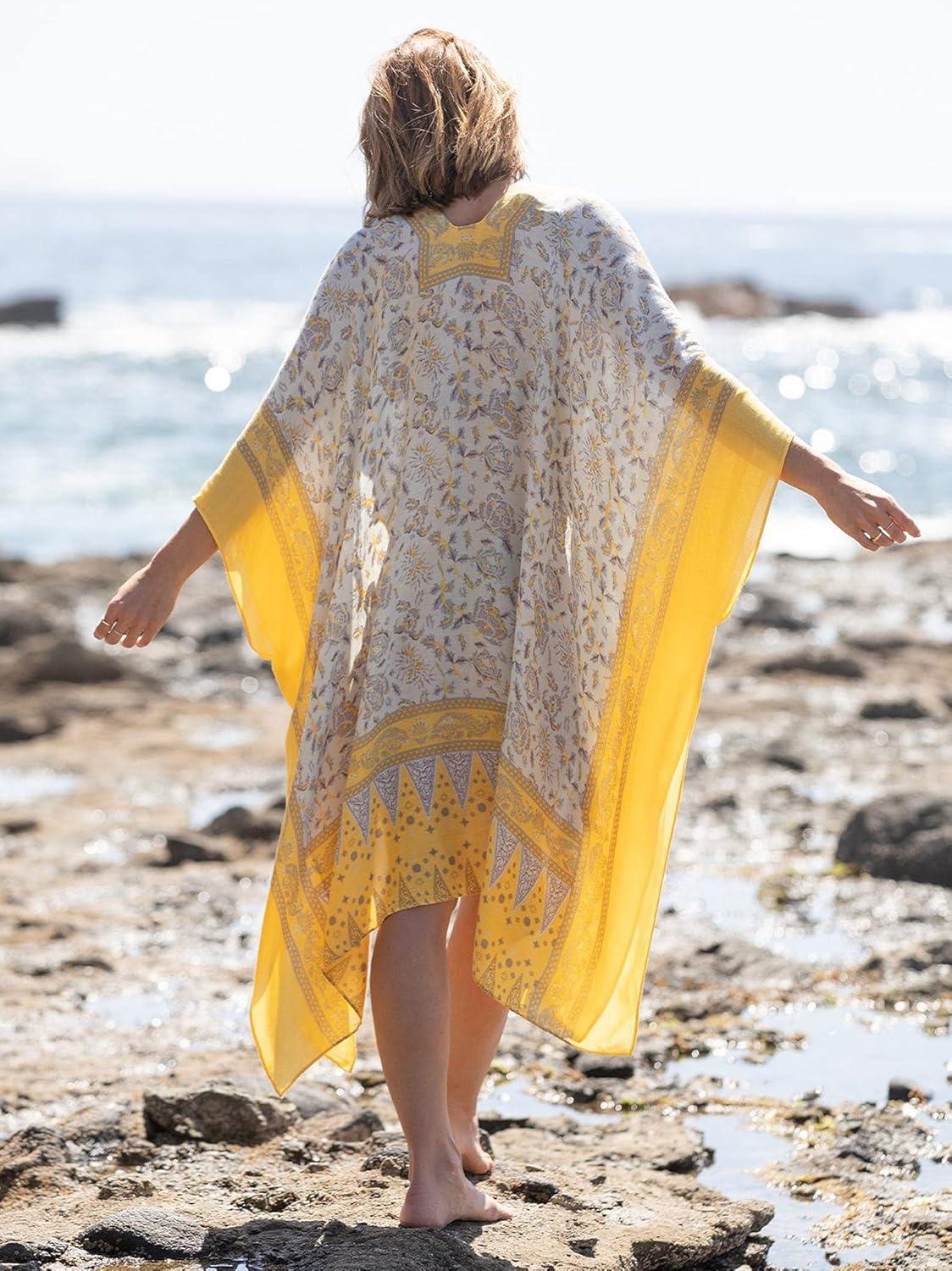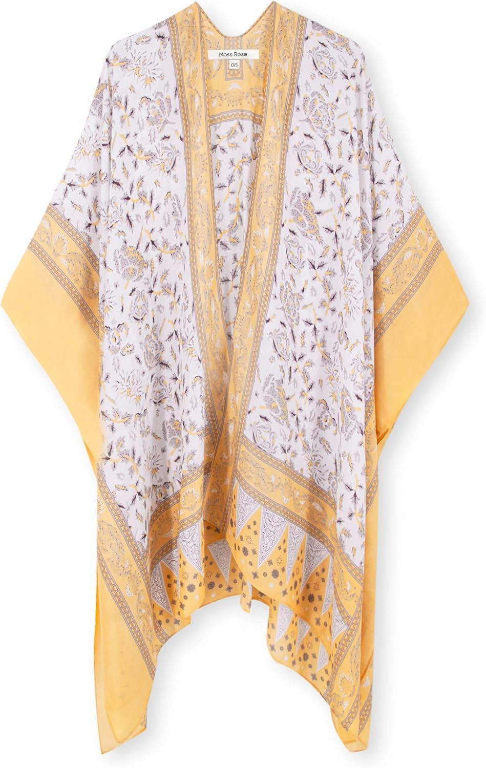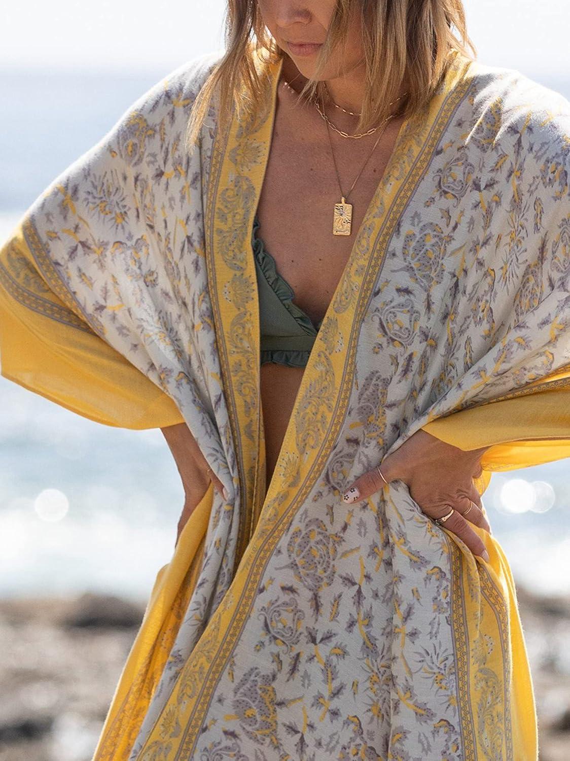 Moss Rose Women’s Beach Cover up Swimsuit Kimono with Bohemian Floral Print, Loose Casual Resort Wear(C Cream)