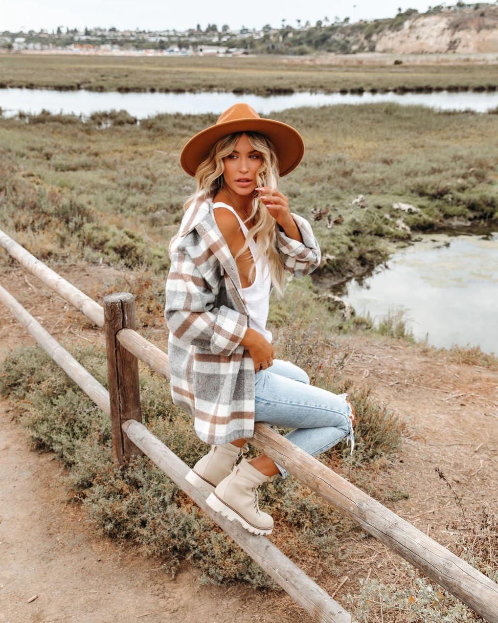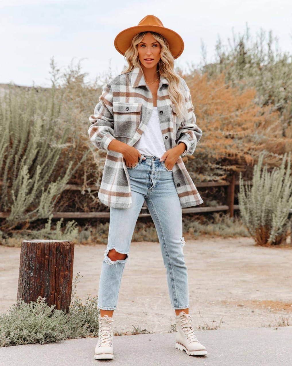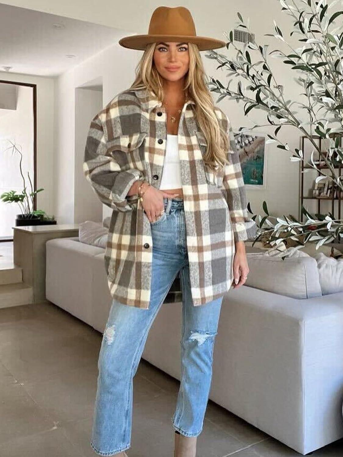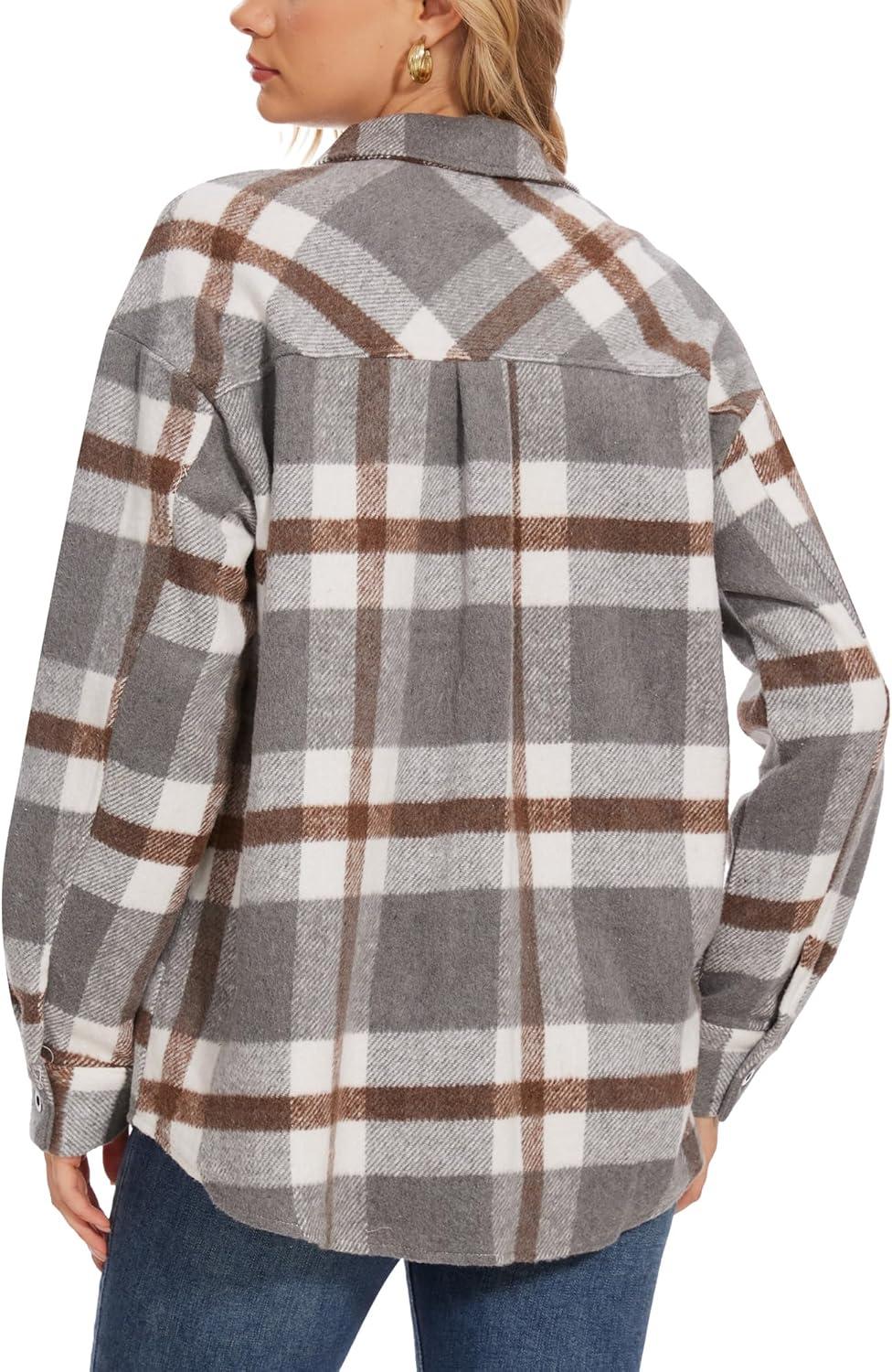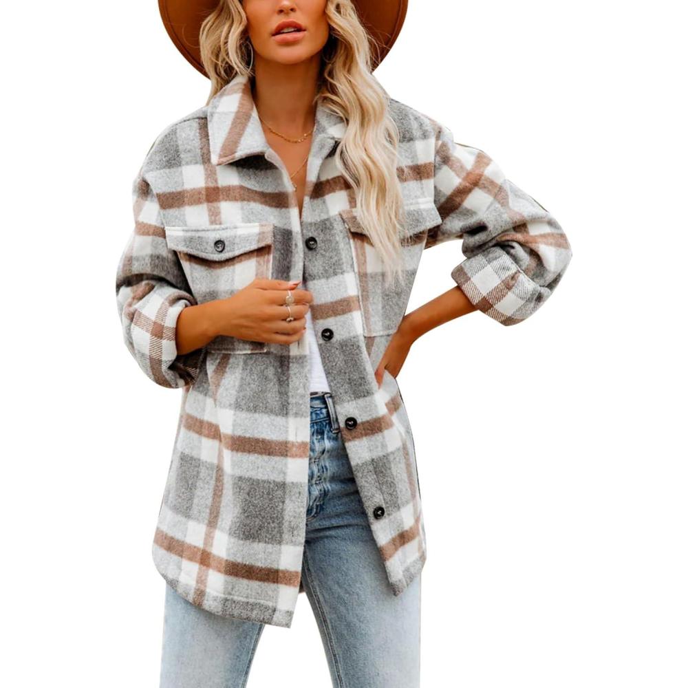 Moss Rose Womens Casual Plaid Shackets Button Down Long Sleeve Jacket Coats Shirts(Grey)