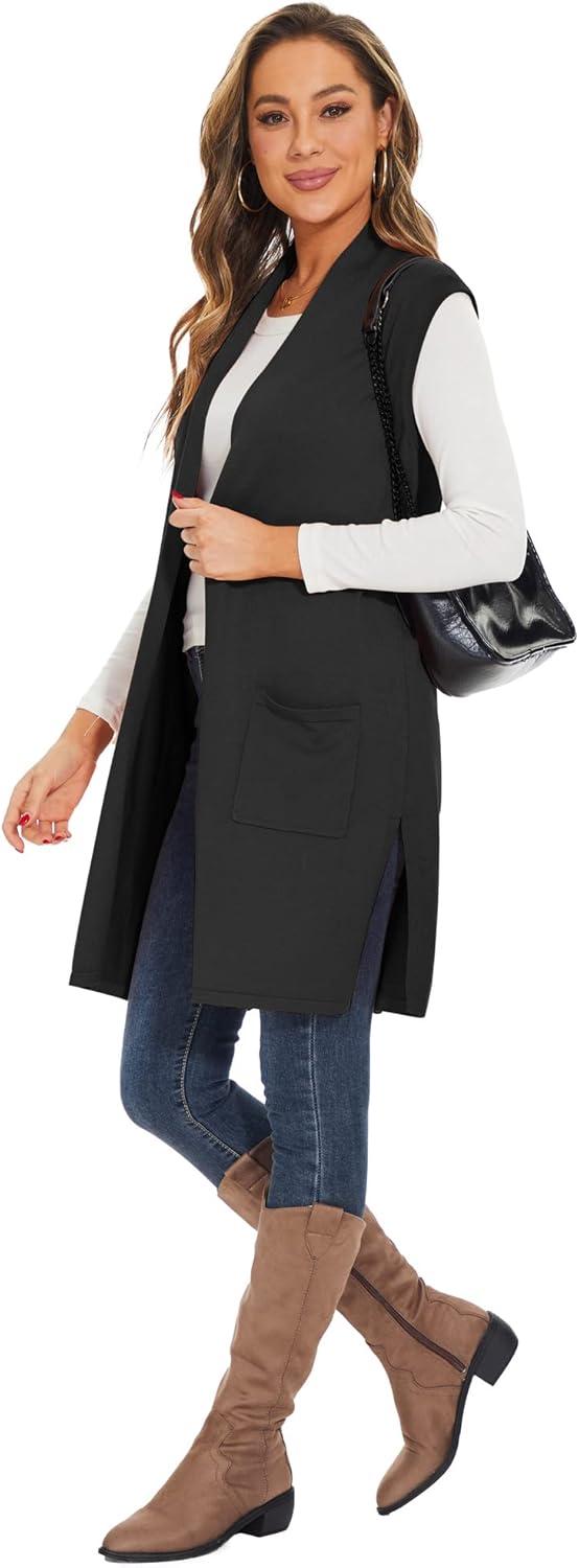 Moss Rose Women’s Long Knit Cardigan Vest Casual Sleeveless Open Front Draped Duster Vest (Available in Plus Size)((Pocket)black)